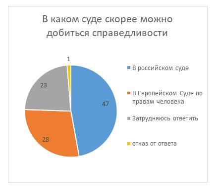 Вторая диаграмма описывает отношение людей к возможной утрате права подачи жалоб в ЕСПЧ. И здесь мы сталкиваемся с тем, что 50% респондентов безразличны к потере этого своего права. Вот прям по фигу людям, и все. Хотя ЕСПЧ завален делами из России (по итогам 2018 года четверть всех решений ЕСПЧ касались России), а тысячам россиян, чтобы получить наконец справедливый суд, приходилось доходить именно что до Страсбурга. На этот счёт, впрочем, есть третья диаграмма. Итак, 47% россиян верят, что справедливости скорее можно добиться не в Страсбурге, а в российском суде.